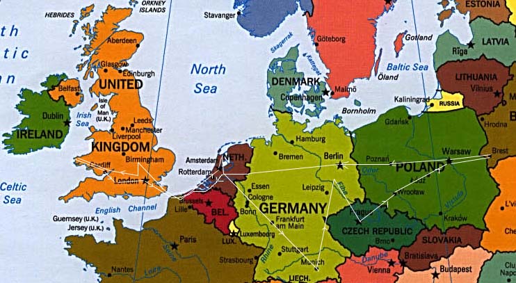 Германию, через Бельгию попадаем в Кале, пересекаем Ла-Манш на