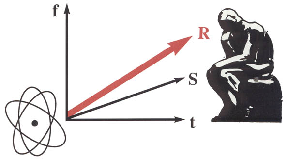 В нашем первом примере мы взяли событие длительностью в одну секунду. Однако, если взять событие, длящееся один час, то его временной период уже можно разбить на 60 минут или 3600 секунд. Секунды можно отсчитывать, начиная с первой, в нарастающем итоге. При этом несмотря на то, что себя мы будем ощущать лишь в интервале последней секунды, общая протяженность события фактически будет продолжаться как сумма секундных интервалов, начиная с первого. Такое суммарное приращение времени по ходу протяженности события следует относить к абсолютному движению во времени. Таким образом, после завершения любого события или при его отсутствии и абсолютного движения во времени не происходит. Ввиду этого можно утверждать, что движение во времени или приращение времени существует только для событий, связанных также с другими изменениями, а для наблюдателя, всегда находящегося в актуальной точке отсчета, приращения времени фактически не происходит и оно для него постоянно остается как t0. О движении во времени наблюдатель, то есть мы с Вами, может судить лишь по косвенным признакам, проявляя тем самым свои способности к абстрактному мышлению.