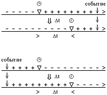 Говоря о направленности течения времени и его обратимости, следует отметить, что если точку отсчета пространственных координат можно совместить с любой точкой пространства и произвольно переместить в другую (по принципу их равновеликой относительности), при этом любое такое перемещение будет иметь положительный знак, то точка отсчета временной координаты совершает свое поступательное движение лишь строго в одном направлении, отмеряя временные интервалы развития той или иной системы или события. В силу этого временная точка отсчета как бы поедает лежащие перед ней интервалы, изменяя знак абсолютного Времени с + на - или наоборот. Так, если мы условимся оставшуюся до какого-то события сумму временных интервалов считать с положительным знаком, то точка отсчета через времени превратит часть положительных интервалов в отрицательные. И наоборот, если мы условимся считать длительность развития какого-то процесса как сумму положительных временных интервалов, то неприсовокупленные еще интервалы далее по оси временной координаты будут считаться как отрицательные, и мгновенная точка отсчета, перемещающаяся по оси, будет менять знак интервалов с - на +. Поскольку в нашей практической жизни мы встречаемся с этим явлением постоянно, его необходимо четко себе представлять.