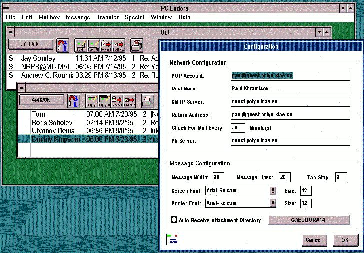 Следует сказать, что формат сообщения постоянно дополняется и совершенствуется. Так в RFC-1327 введены дополнительные поля для совместимости с почтой X.400. Кроме этого, следует обратить внимание на поля некоторых довольно часто встречающихся заголовков, которые не регламентированы в RFC-822. Так первое предложение заголовка, которое начинается со слова From, содержит UUCP-путь сообщения, по которому можно определить, через какие машины сообщение КпробиралосьЧ. Поле Re-ceived: содержит транзитные адреса почтовых серверов с датой и временем прохождения сообщения. Вся эта информация полезна при разборе трудностей с доставкой почты.