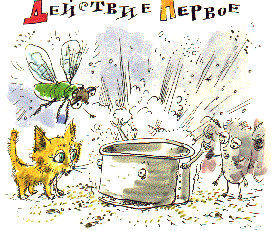 Грохот Кастрюли. На ее шум сбегаются: Котенок, Карасик, Мотылек и Муха.