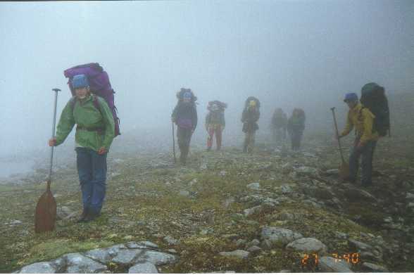 Обнос по правому берегу по курумнику, заросшему лесом. Мало не