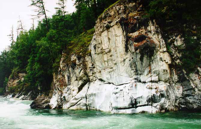 Следующий на маршруте именной порог, "Мраморный", запоминается прежде всего своей красотой. Река, упираясь в живописную мраморную скалу, делает поворот (как всегда правый).