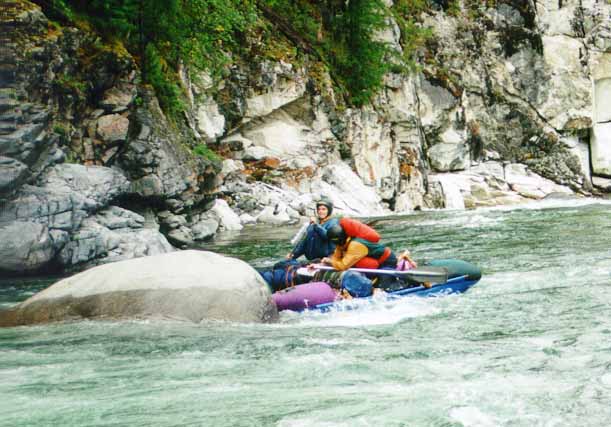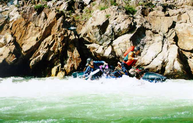 Ребята не рассчитали силу прижима и с трудом прошли вплотную к берегу. Бочка их изрядно тормознула, левый баллон попал в улово и их прижало к скале. Впрочем, от скалы после непродолжительной борьбы они удачно отпихнулись и, траверснув, припарковались с правого берега.