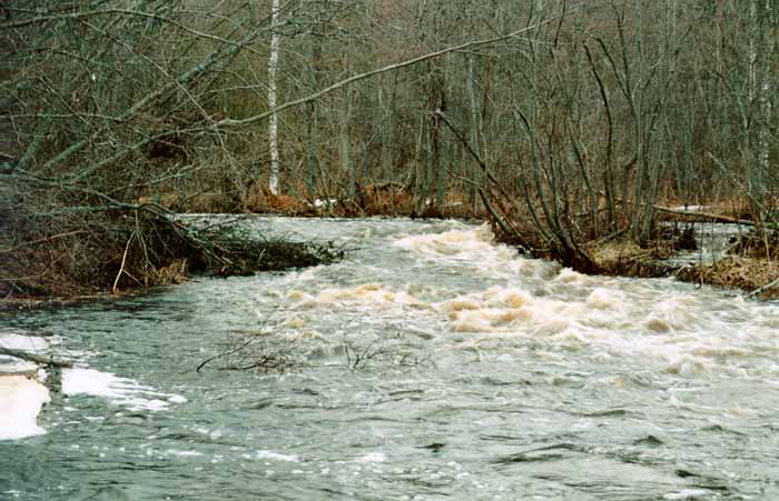 Отплыли примерно в 13.30. Речка узкая, ветки близлежащих деревьев в русле, встречаются завалы. Воды очень много, на начальном отрезке реки вода залила весь лес, так как берега низкие, заболоченные.