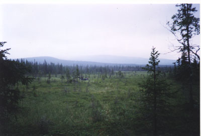 От "брода" до границы леса в верховьях Чортуя шли два дня. В долину Вувы попали "взяв штурмом" отрог горы справа от Вуима. Этот отрог мы вначале ошибочно приняли за нужный нам перевал. С отрога хорошо видна безлесная долина Вувы, нужный перевал в долину Печи, скалы над обозначенным на карте озером на склоне. С отрога шли траверсом, не теряя высоты к перевалу. Прошли рядом с озером