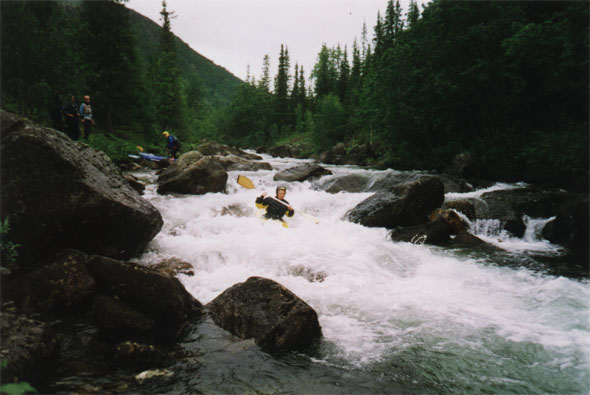 Выбор оптимального судна для такого похода задача весьма непростая, которая, видимо, не имеет точного решения. Наиболее подходящими можно считать не очень длинные полиэтиленовые каяки (Reflex, например, явно был великоват), каркасные каяки, ну и, наверное КНБ (с большими оговорками). Таймень с не облегченной (резиновой) шкурой - лодка явно не подходящая, катамараны тоже - речка слишком мелкая и каменистая, расход небольшой.