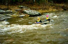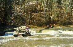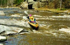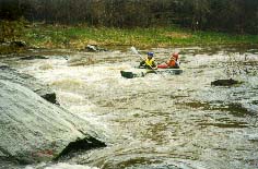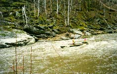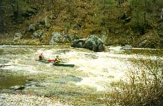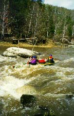 Обязательная разведка и страховка, особенно 3 и 4 ступеней. Первая и вторая ступени проходятся у левого берега. После прохождения слива 2 ступени резкий уход вправо от камней. Главный слив третьей ступени более безопасно проходится у левого берега с резким траверсом к правому берегу. Возможно прохождение главного слива 3 ступени и у правого берега, но в этом случае надо очень точно войти в поток, иначе неизбежно опрокидывание байдарки или уход ее под скалу справа. Шивера после главного слива 3 ступени проходится в центре русла. Страховка 1-3 ступеней с левого берега. Вход в 4 ступень в центре русла, прохождение больших камней -- у правого берега, далее -- в центре русла, выход из шиверы -- ближе к правому берегу. Страховка с правого берега. |