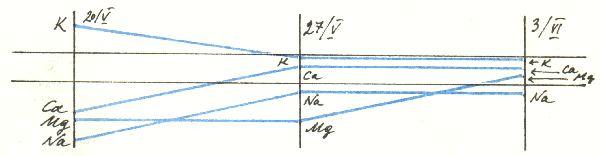 Аналогичным путем устанавливаются графические характеристики других элементов: для кальция из расчета 9-13 мг%, для магния 1,5-3,5 мг% для натрия 210-350 мг%. Изменение концентрации на 1 мг% для кальция соответствует 5 мм графика, для натрия - 0,5 мм и для магния - 10 мм. Результат каждого анализа отмечаем на ординатах. Величины, показывающие содержание каждою элемента в последующих анализах, соединяем прямыми линиями.